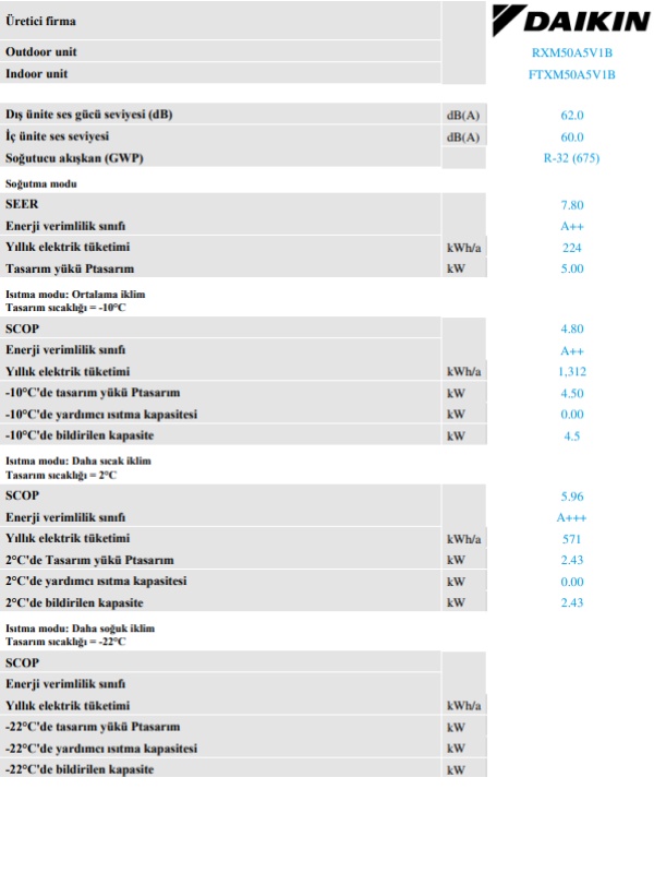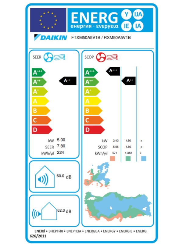 Sezonsal verimlilik değerleri soğutma ve ısıtma için A+++ seviyesine kadar