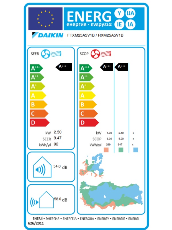 Sezonsal verimlilik değerleri soğutma ve ısıtma için A+++ seviyesine kadar